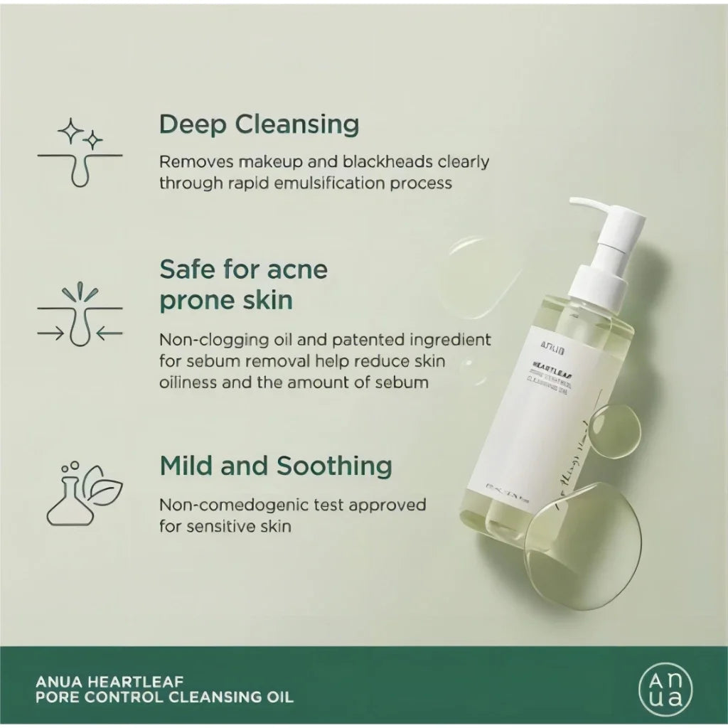 Experience gentle yet effective cleansing with the anua HEARTLEAF PORE CONTROL CLEANSING OIL. Formulated with 77% heartleaf extract, this lightweight oil effortlessly dissolves makeup, impurities, and excess sebum while maintaining the skin's natural moisture balance. Suitable for all skin types, it leaves the skin feeling clean, refreshed, and nourished.