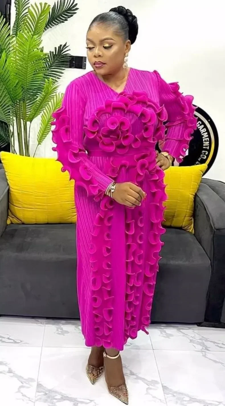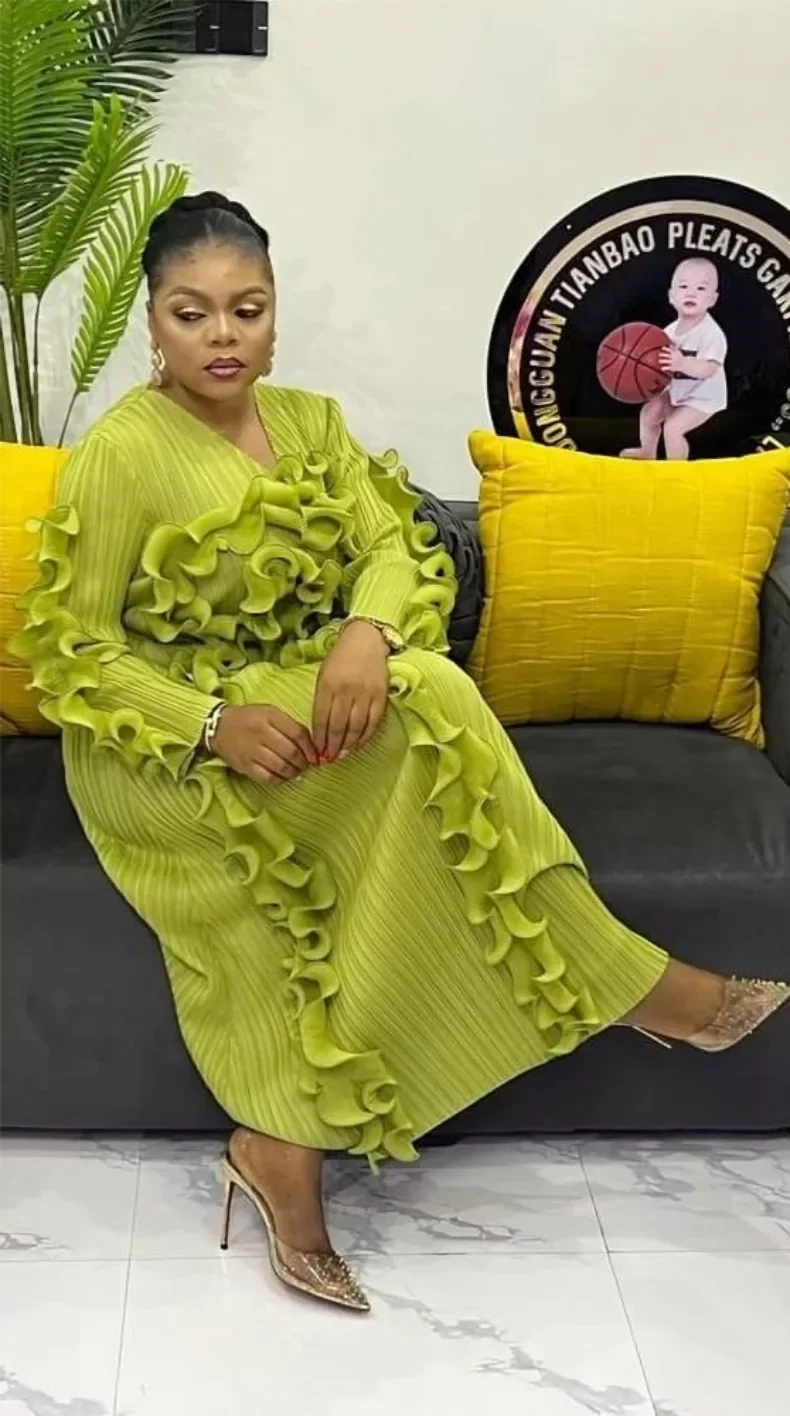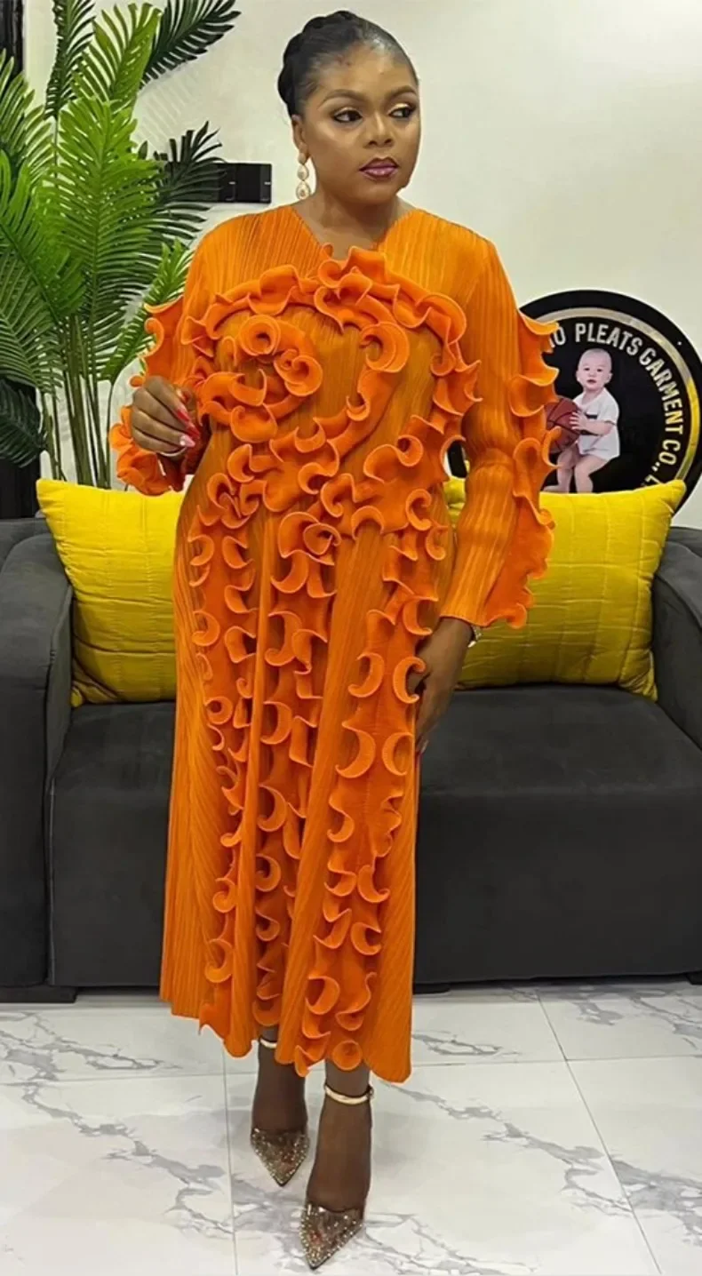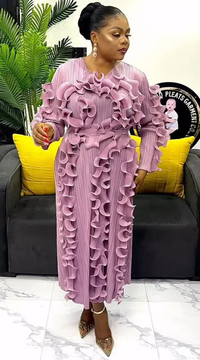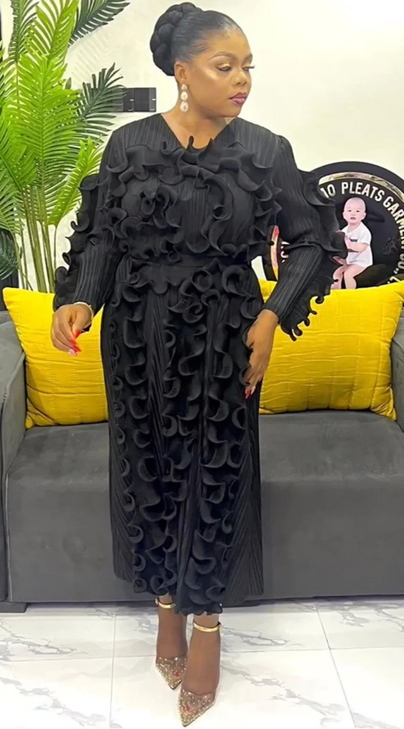 Fashion Designer Miyake Pleated Women's Dress Ruffles Spliced Solid Color Slim Fit Long Dresses 2025 Autumn New