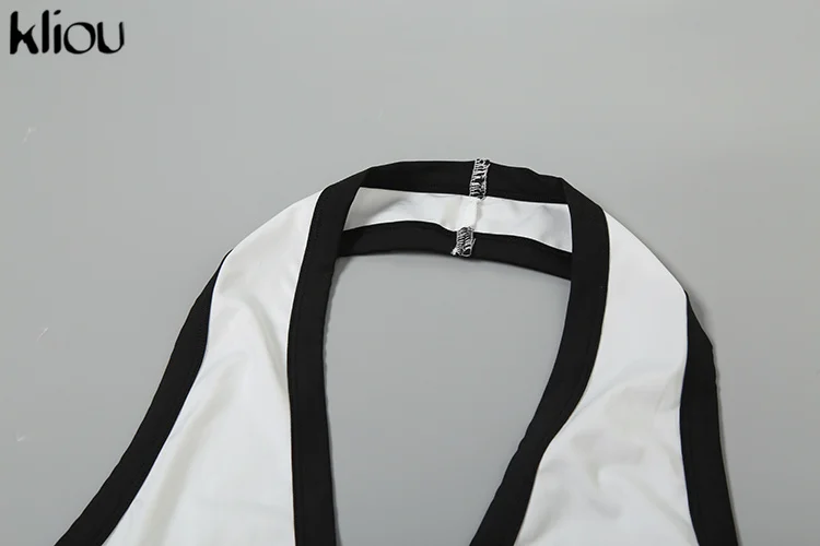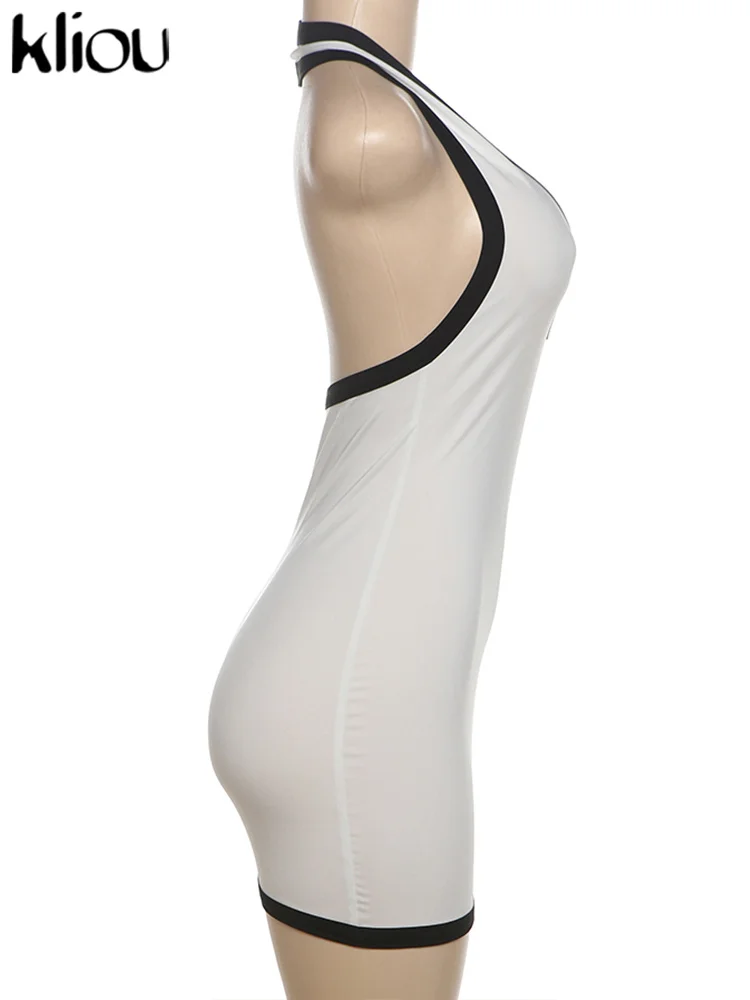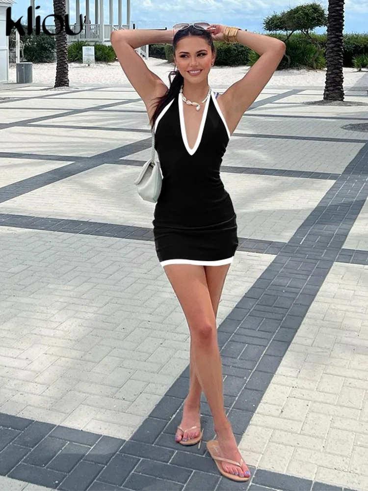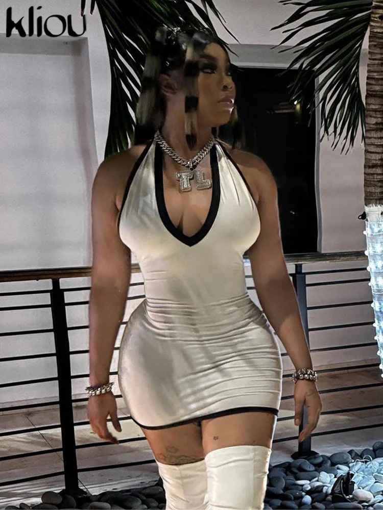 kliou Halter Women Dresses Classic New Panelled Trim Backless V-neck Body-shaping Simple Vestidos Female Summer Thin Streetwear