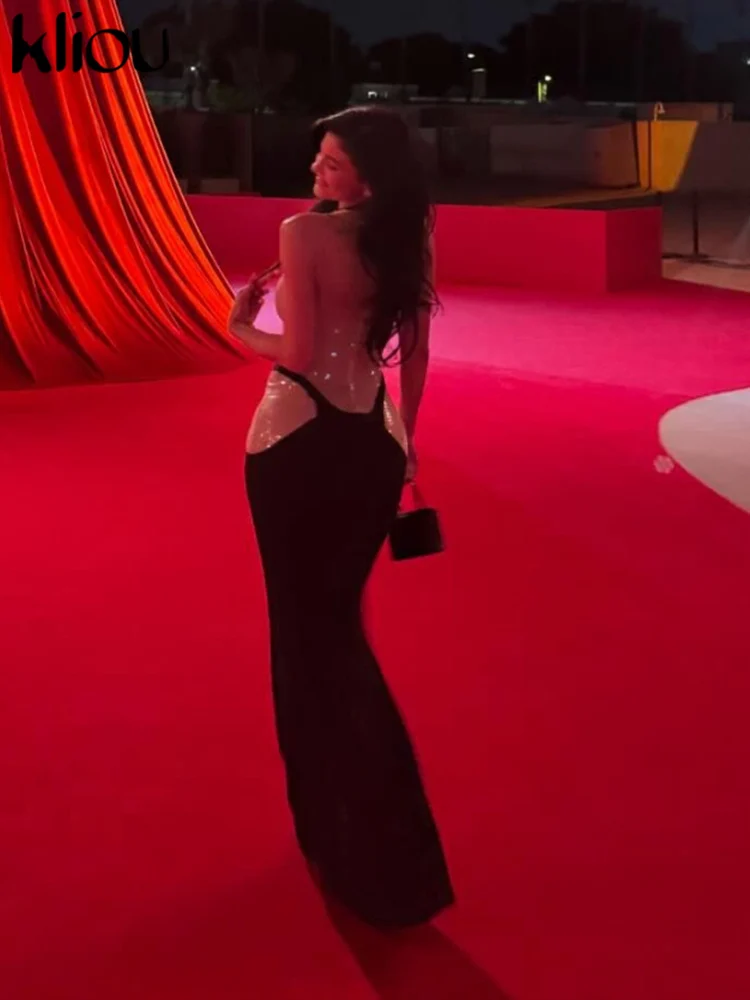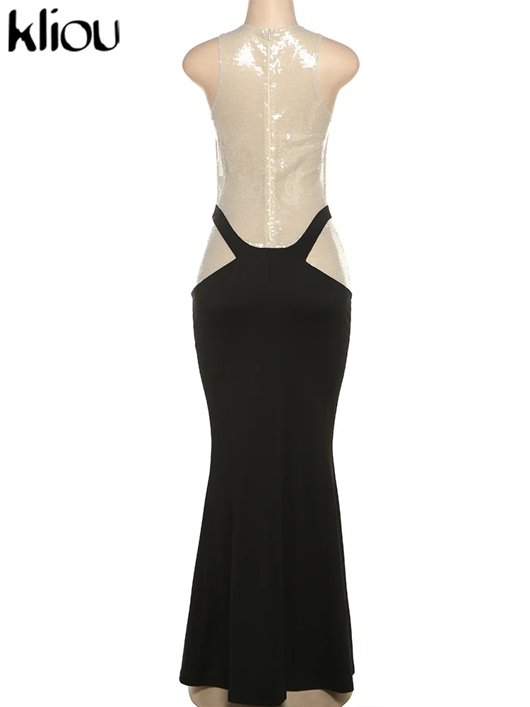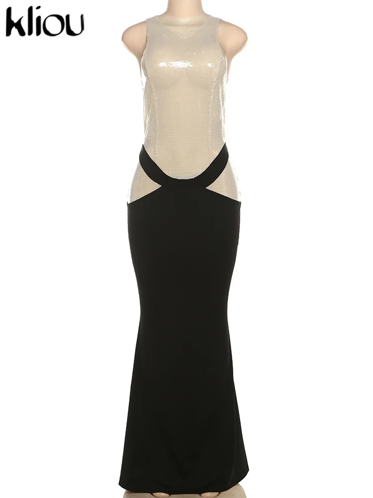 kliou Patchwork Sequins Women Maxi Dress Elegant Contrast Colors O-neck Sleeveless Bodycon Mujer Evening Wear Stunning Vestidos