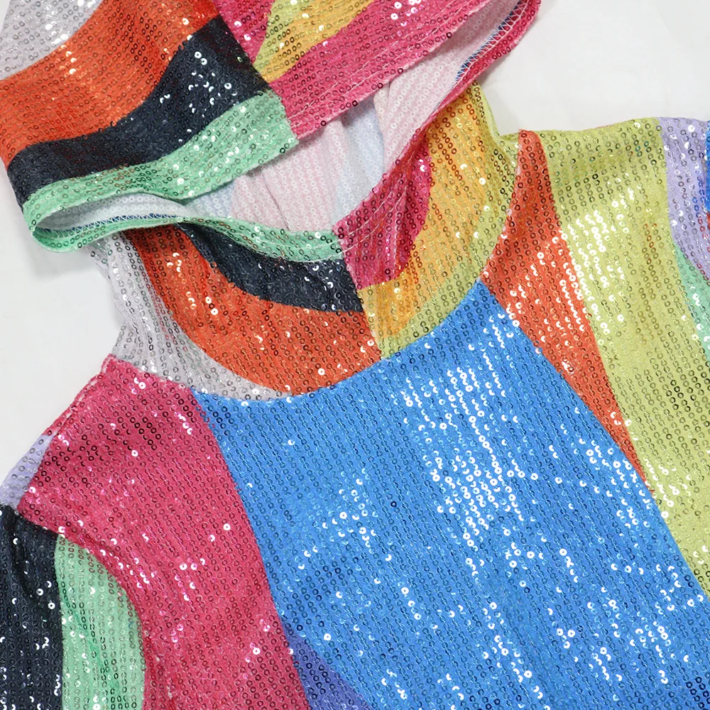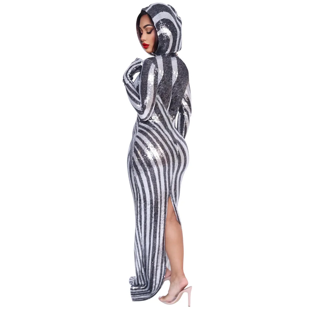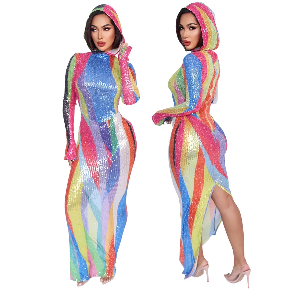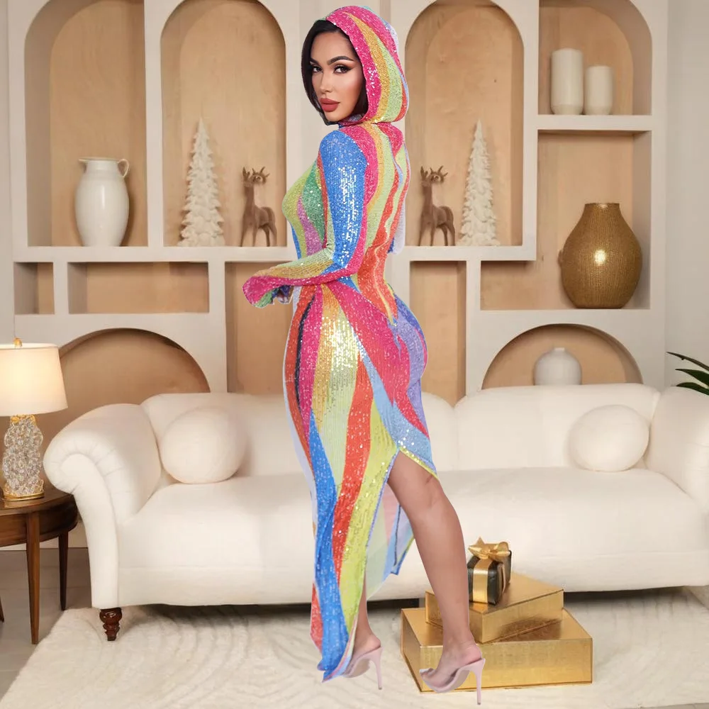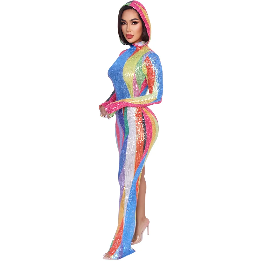 LKF Performance Dress, Nightclub Bar Sexy Dress, Colorful Striped Sequin High Slit Hooded Dress