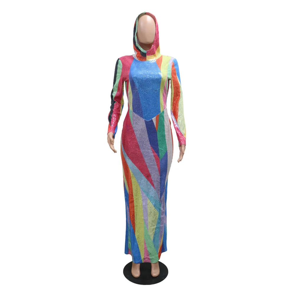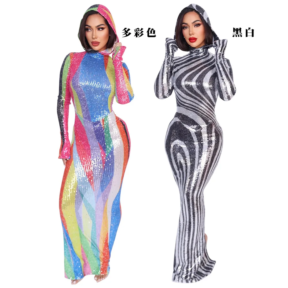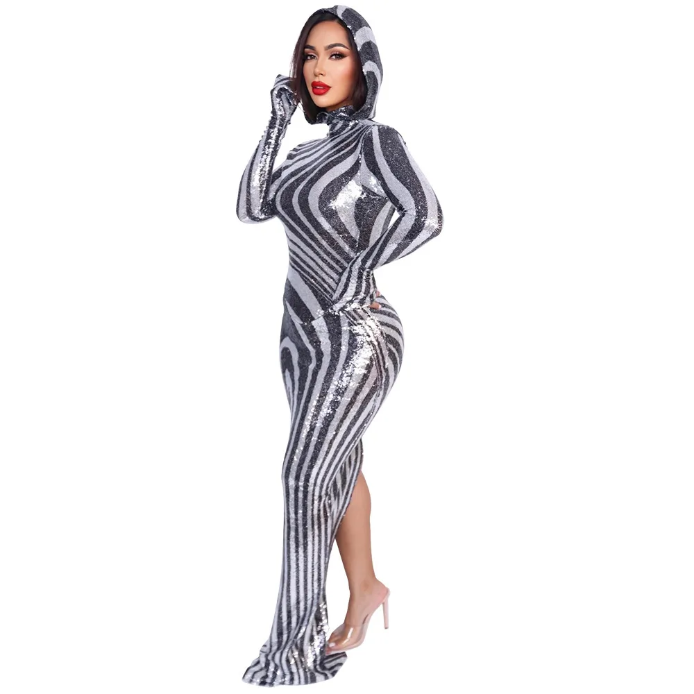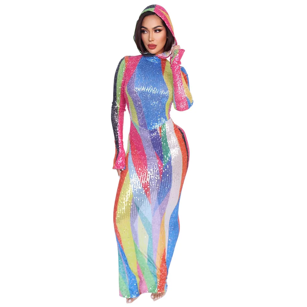 LKF Performance Dress, Nightclub Bar Sexy Dress, Colorful Striped Sequin High Slit Hooded Dress