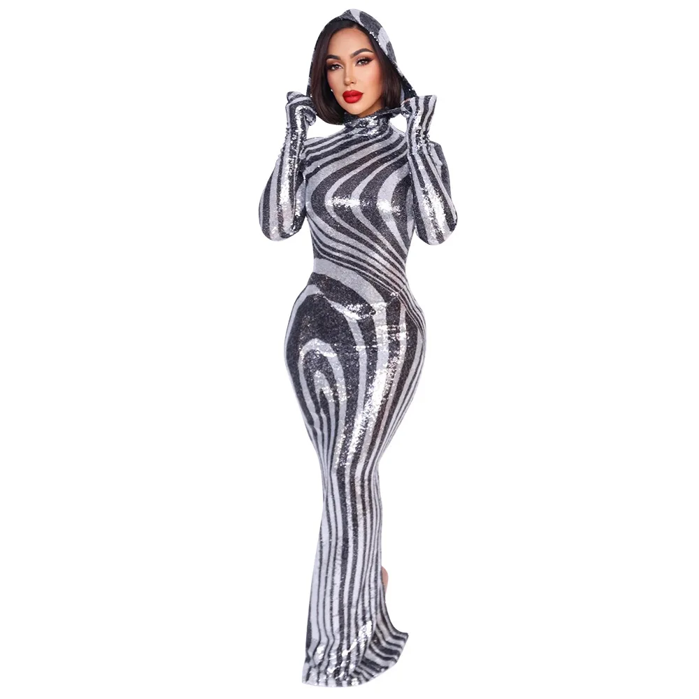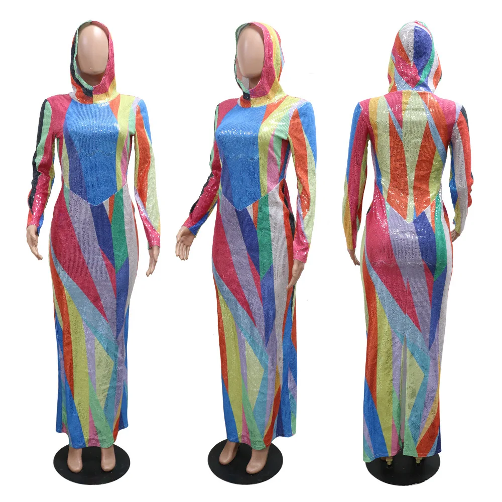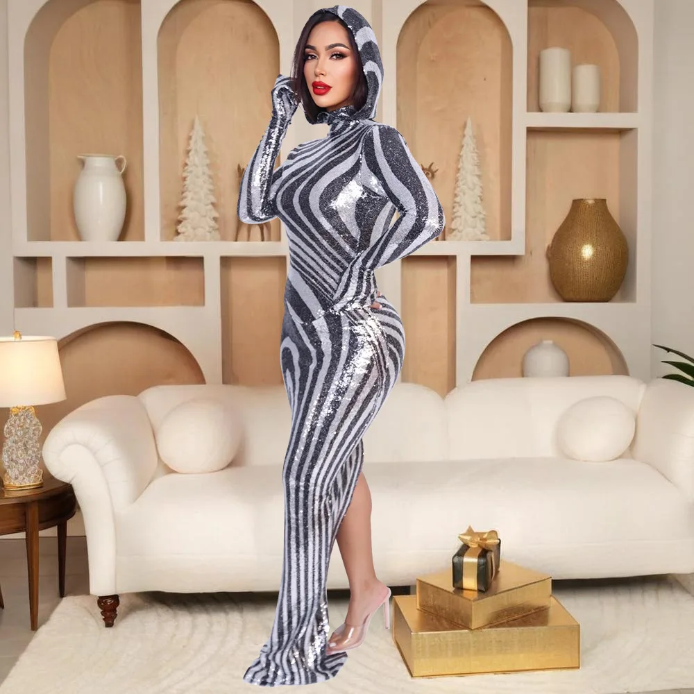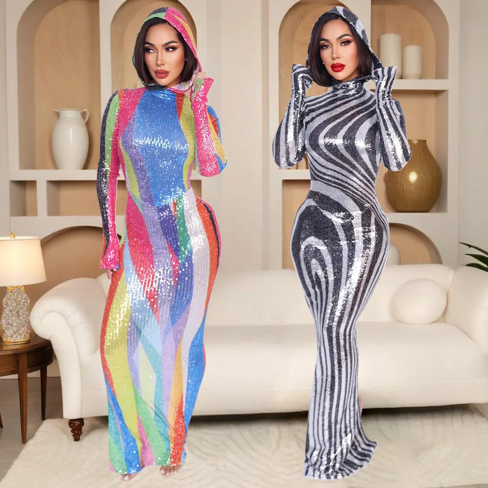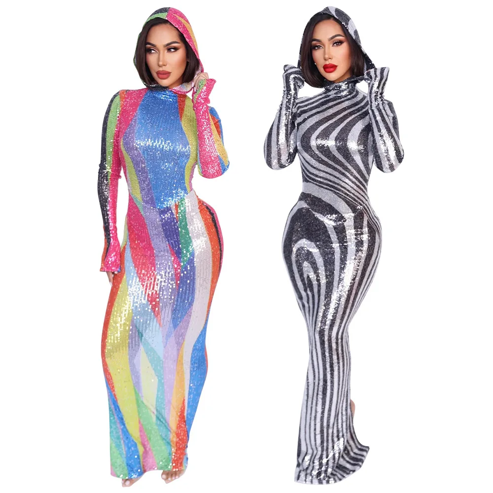 LKF Performance Dress, Nightclub Bar Sexy Dress, Colorful Striped Sequin High Slit Hooded Dress