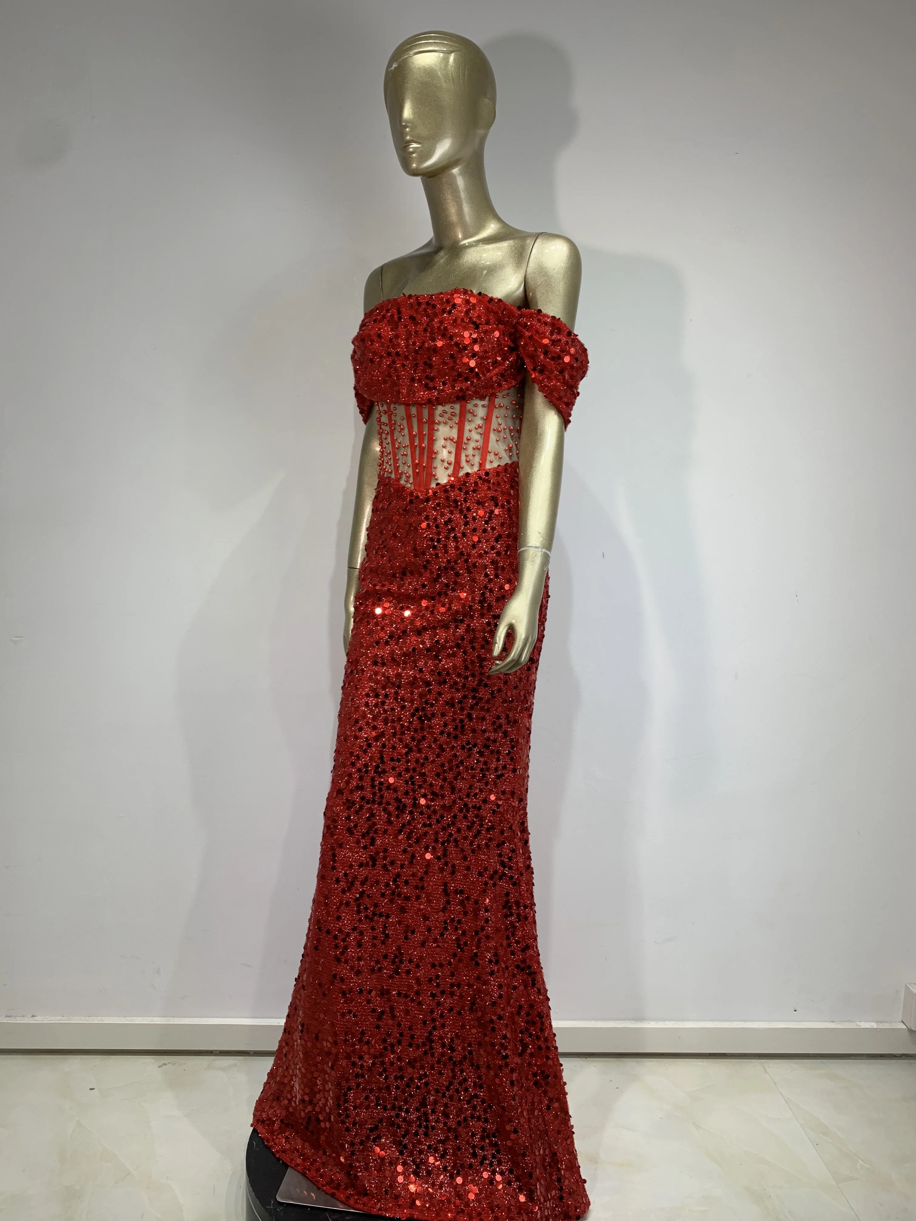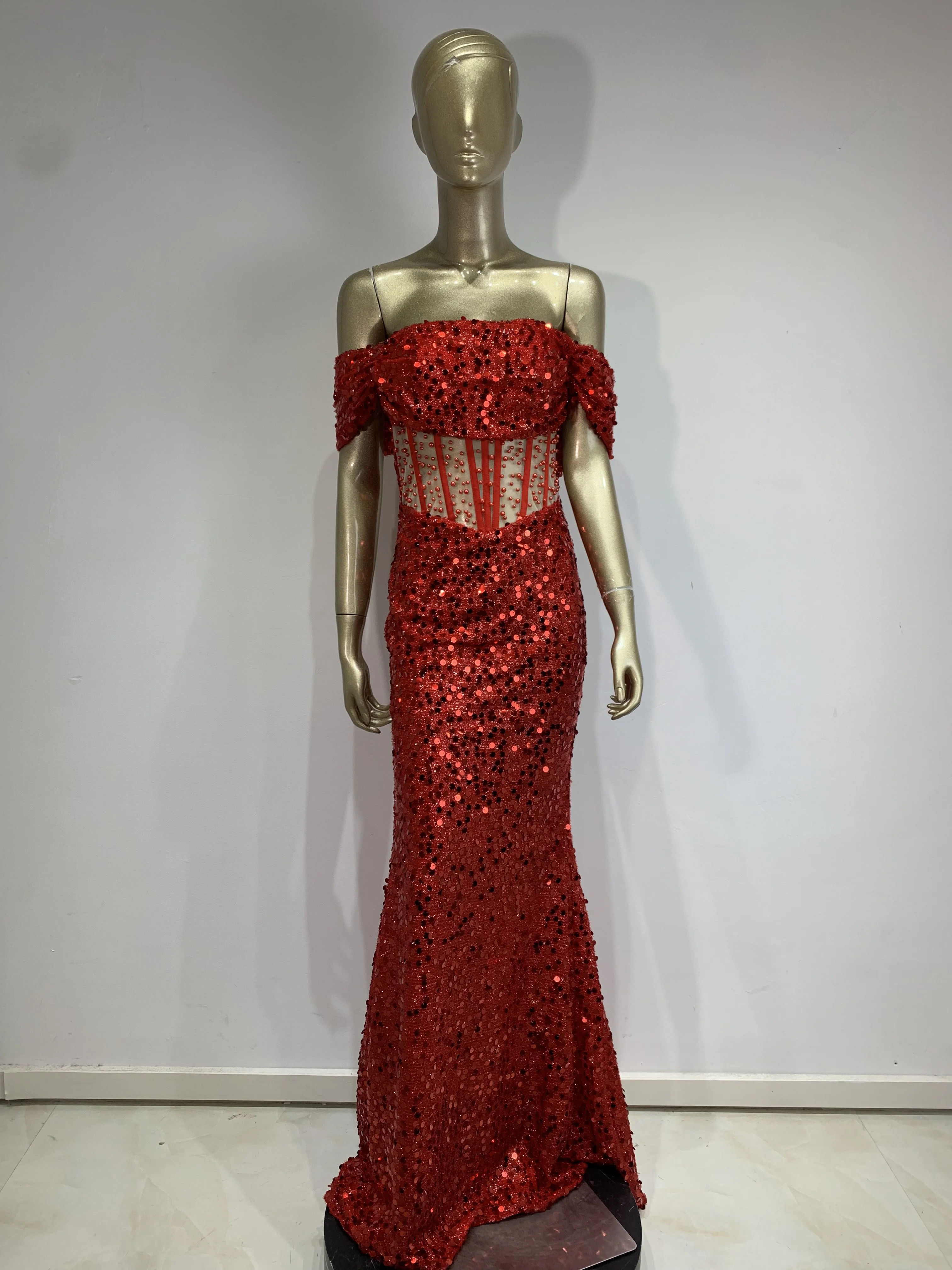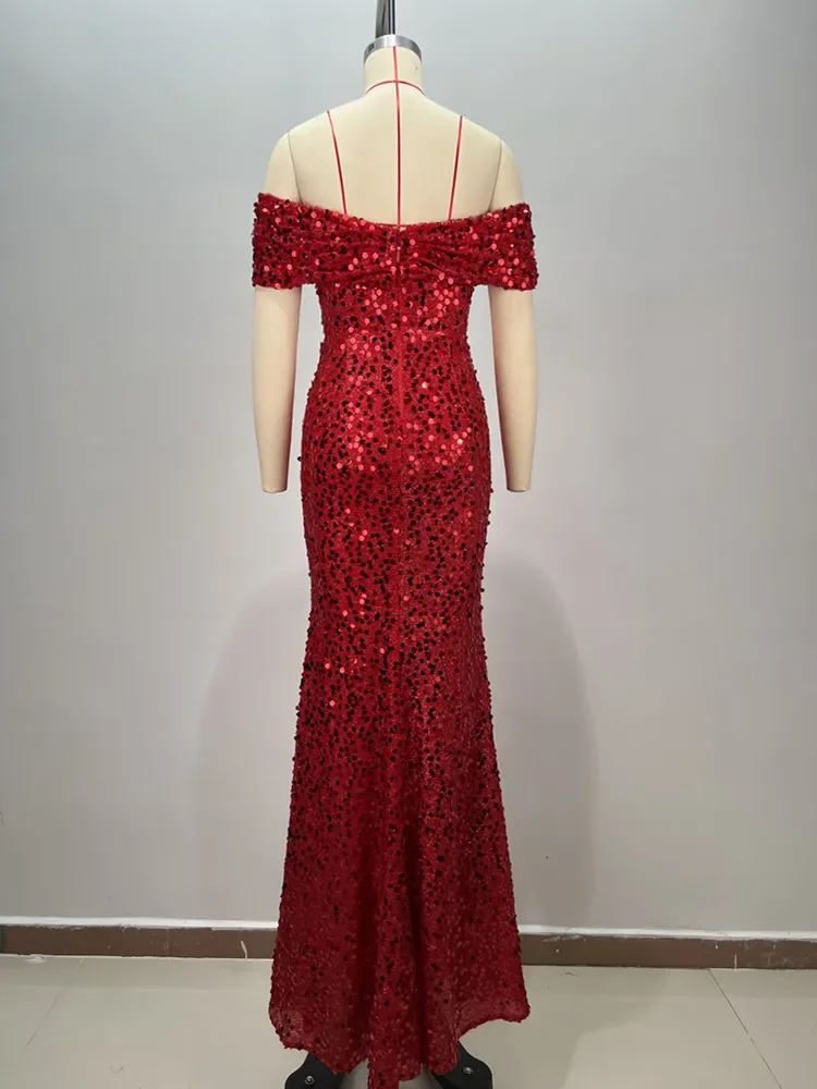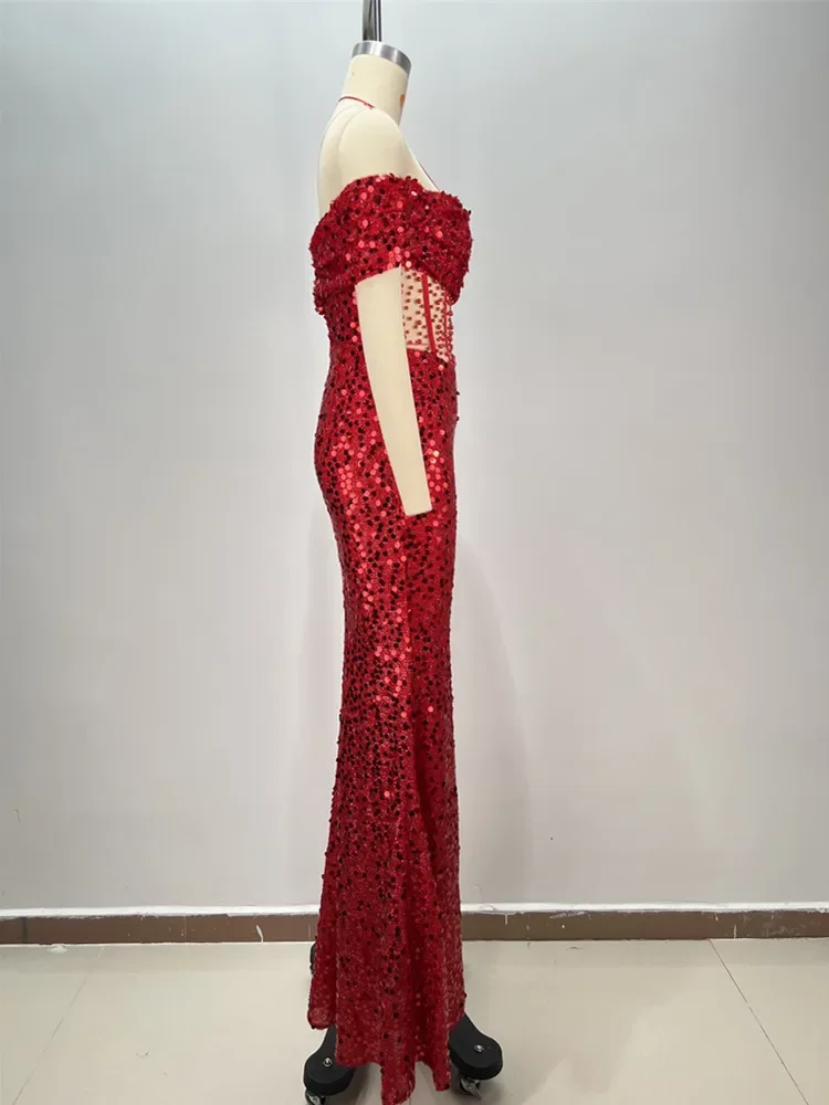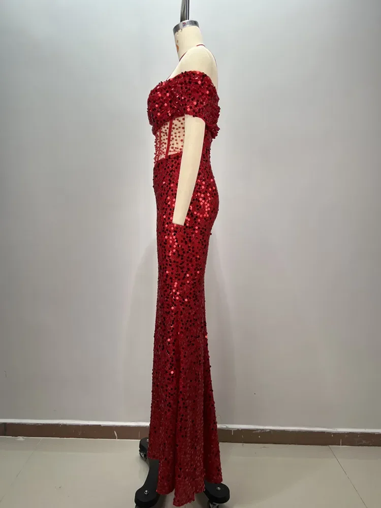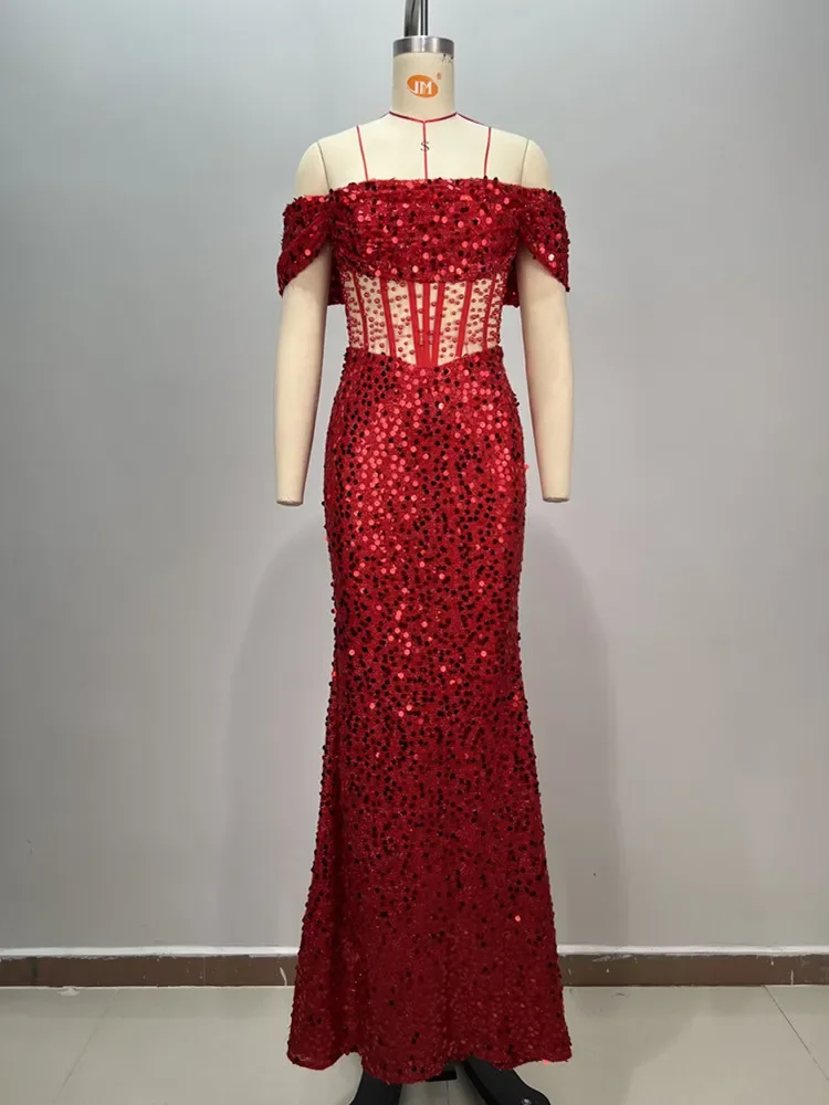 Luxury Prom Gowns for Women Elegant Red Off Shoulder Sequines Corset Maxi Long Sparky Dresses Birthday Celebrity Evening Gowns