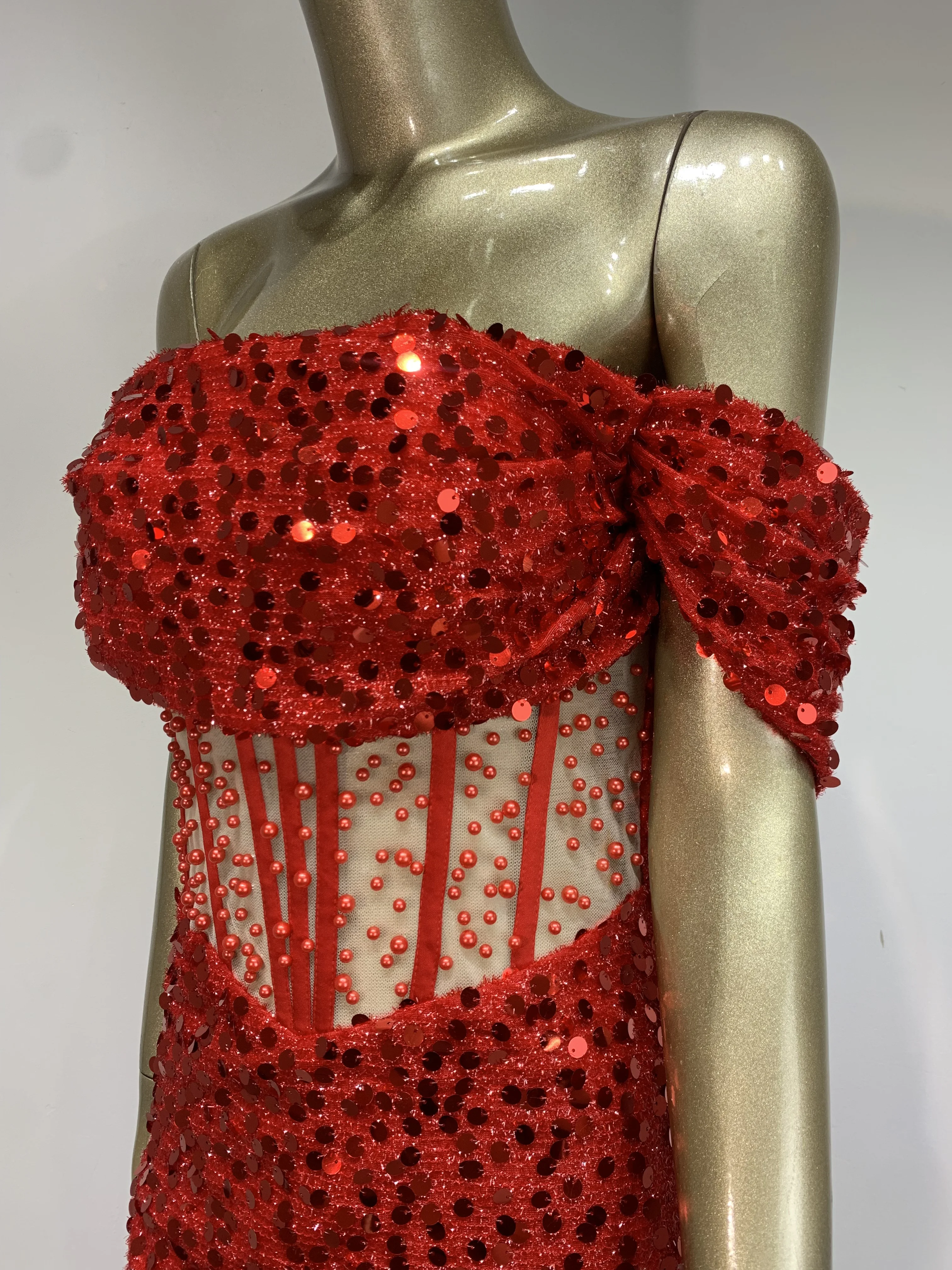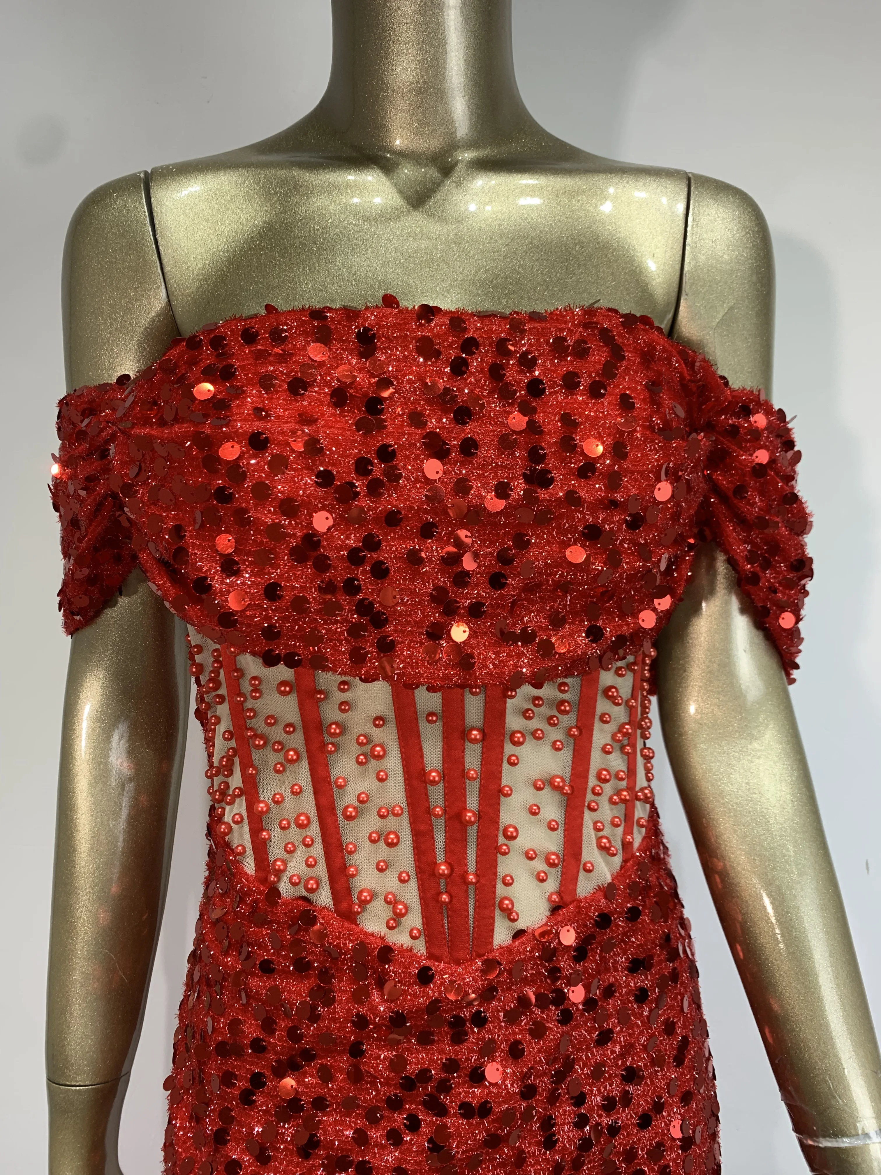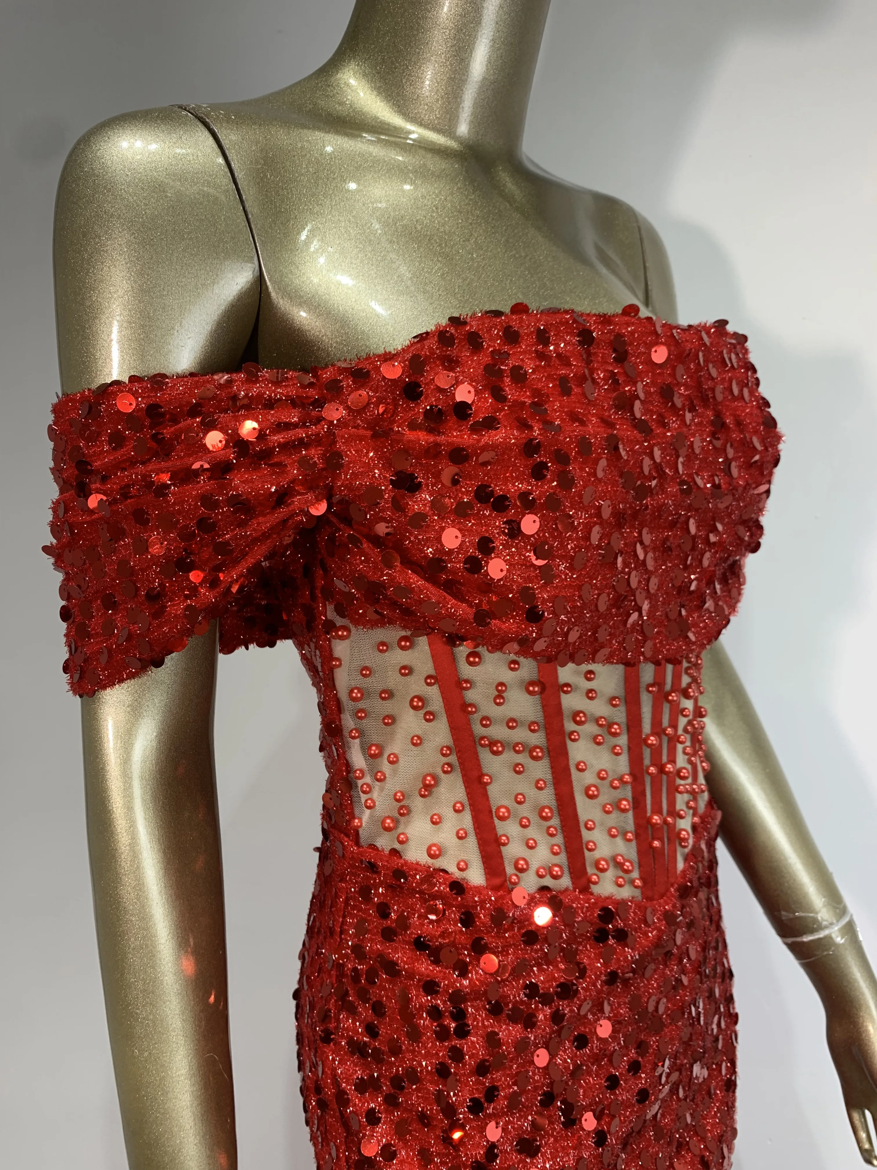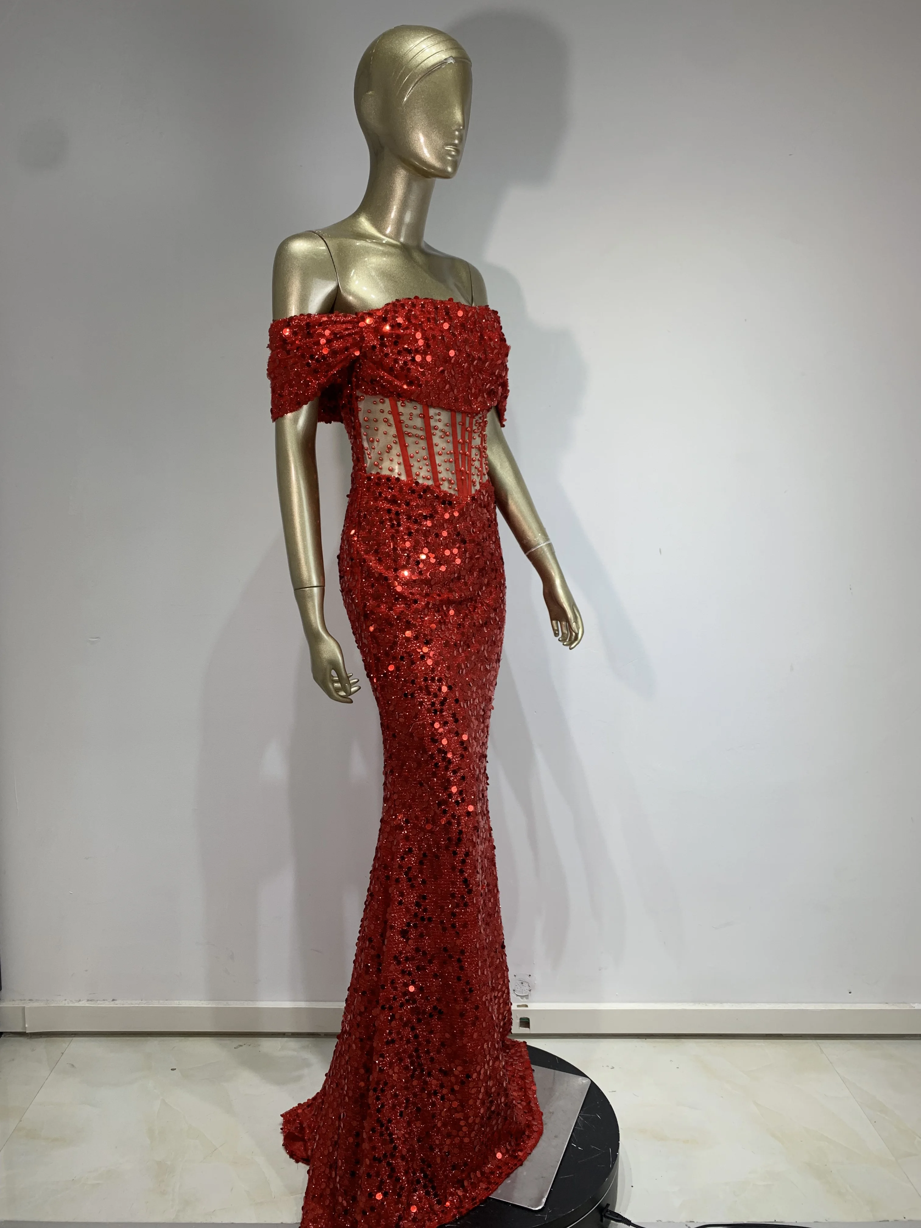 Luxury Prom Gowns for Women Elegant Red Off Shoulder Sequines Corset Maxi Long Sparky Dresses Birthday Celebrity Evening Gowns