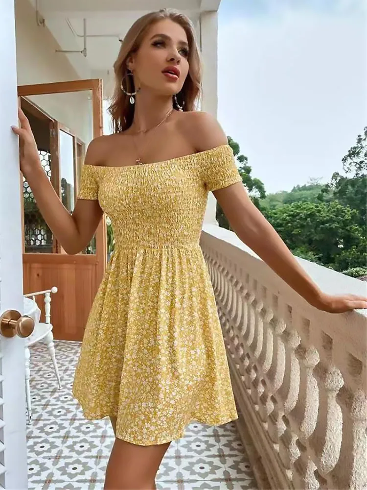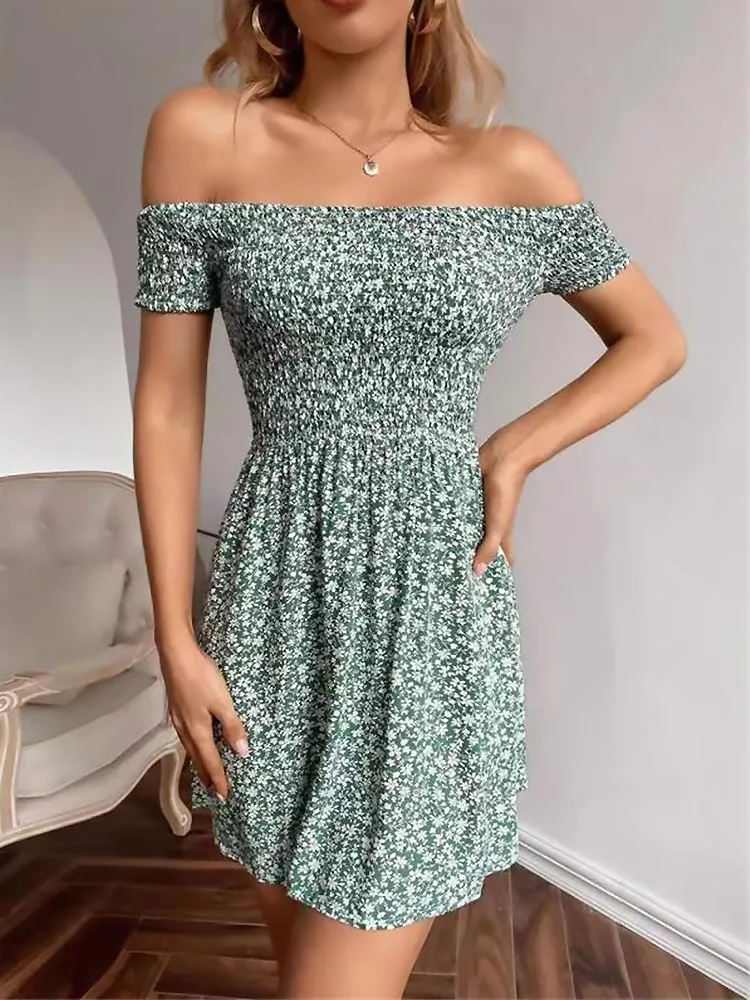 Spring and summer new European and American women's dress hot selling a line neck off-the-shoulder floral dress