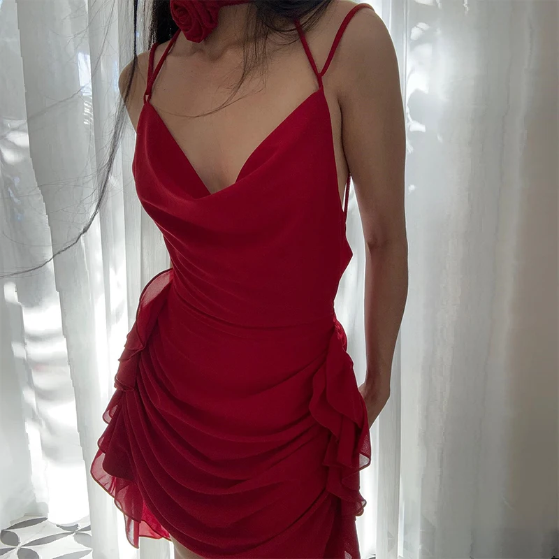 WhereMery Elegant Women Ruffles Backless Mini Dress Y2K Fashion Sleeveless Halter 2024 Summer Dresses Sexy Low-cut Tight Vestido