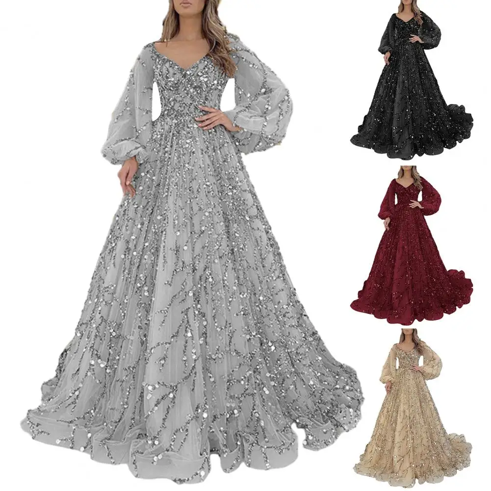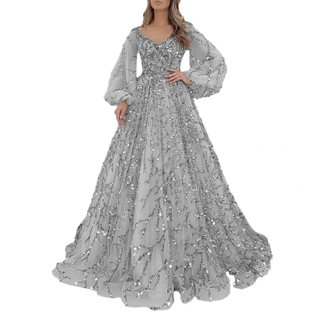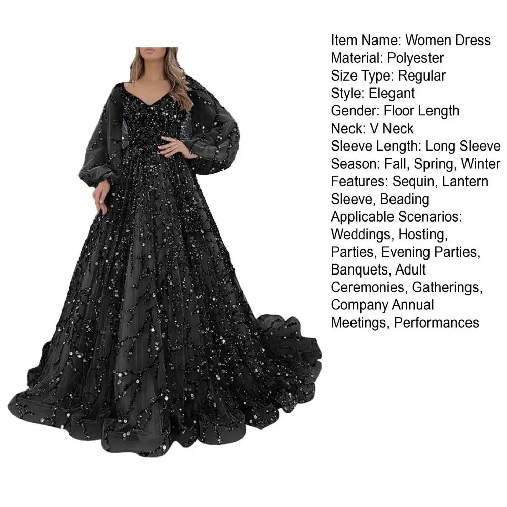 Women Evening Dress V Neck Lantern Sleeve Shiny Sequin Beading Padded A-line Floor Length Mesh Double-layered Cocktail Party Dress Formal Prom Gown
