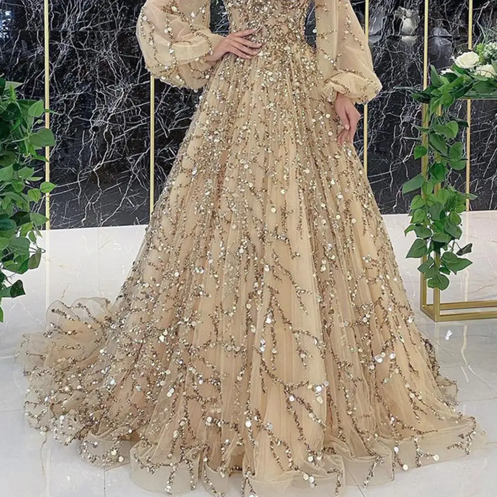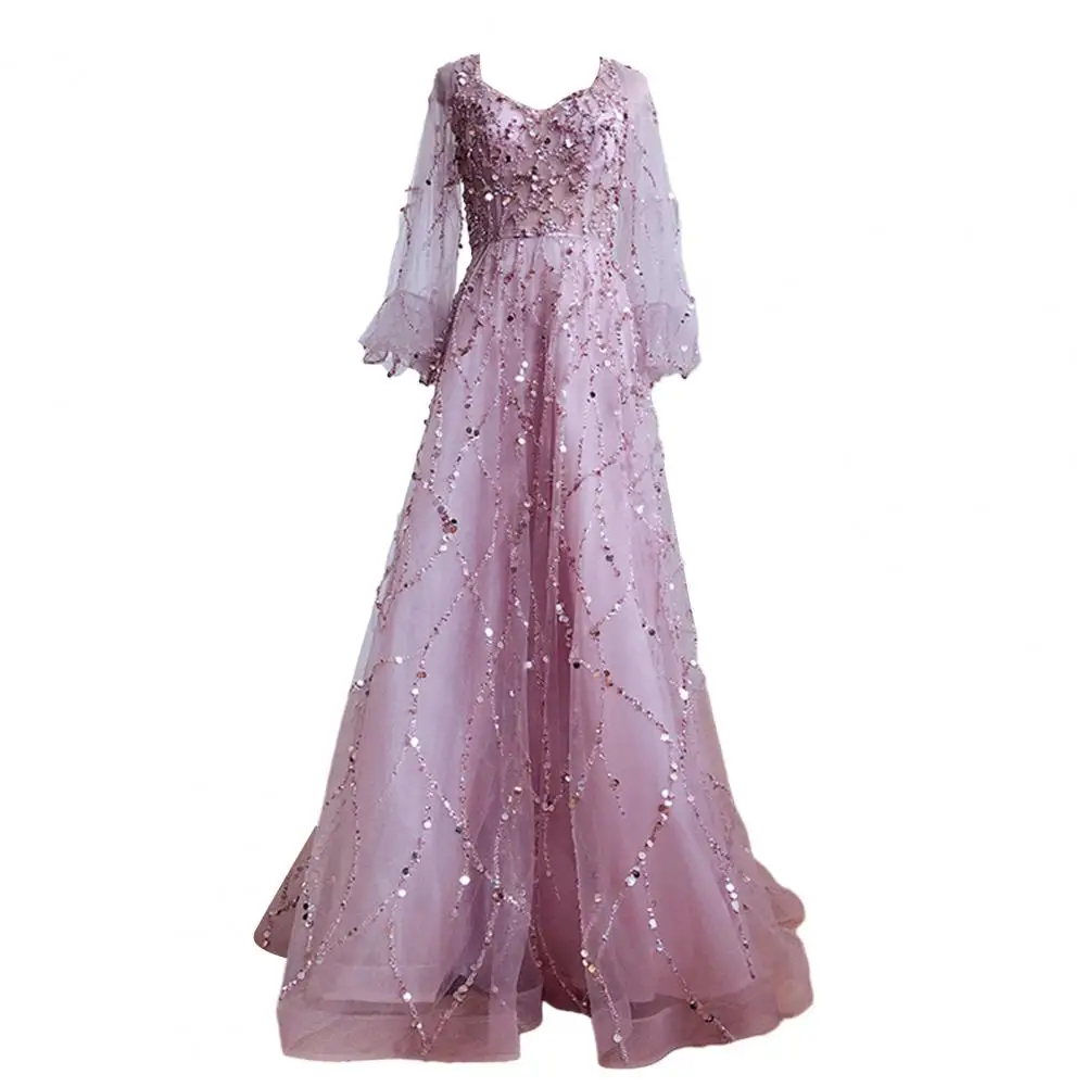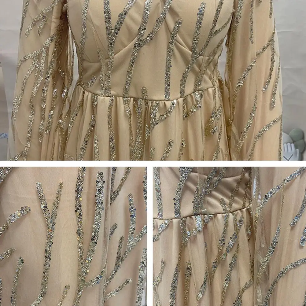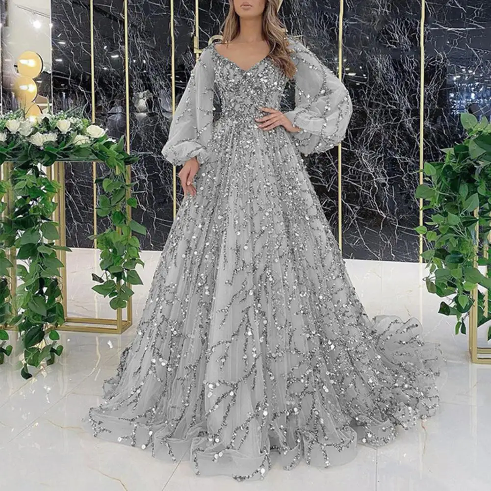 Women Evening Dress V Neck Lantern Sleeve Shiny Sequin Beading Padded A-line Floor Length Mesh Double-layered Cocktail Party Dress Formal Prom Gown