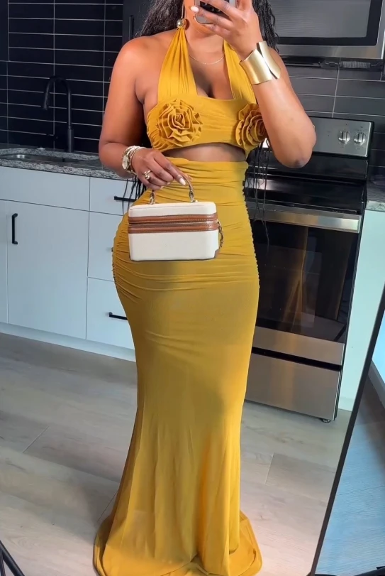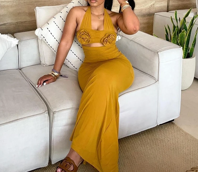 Fabric name: PolyesterPattern: Solid colorProcess: Printing and DyeingStyle: neck hanging styleCombination form: single pieceSkirt length: Long skirtSkirt Type: One Step SkirtNeck Type: Hanging NeckSleeve type: sleevelessSleeve length: sleevelessWaist type: high waistPopular element: flowersMain fabric composition: polyester (polyester fiber)Style type: Fresh and sweetFront placket: lace upMain fabric composition: 95% or aboveStyle: Sweet Wind
